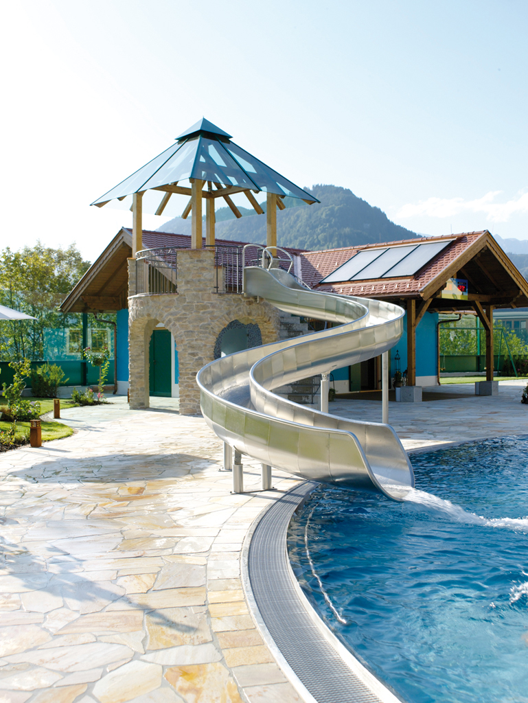 Горка типа Анаконда в форме желоба это наиболее желательный аттракцион для открытых бассейнов. Эта горка является безлопастная, потому что мы можем наблюдать посетители как катаются на горке.